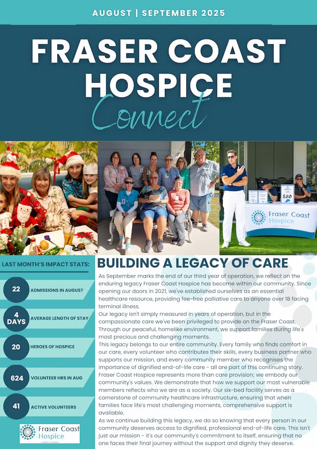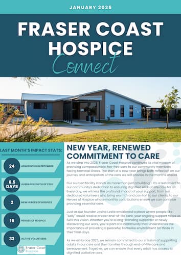 Get the inside story on how your community hospice is making a difference. Our regular newsletters share client impact stories, volunteer spotlights, upcoming events, and behind-the-scenes updates from the team. It's your direct connection to the heart of Fraser Coast Hospice. Sign up to stay in the loop with news that matters to our community.