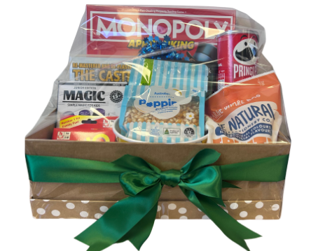 Everything you need for a classic night of fun at home! This basket is packed with favourites including Monopoly, UNO, a magic trick set, DVDs, and tasty treats like lollies, popcorn and Pringles - perfect for bringing family or friends together for laughs, friendly competition and a cosy night in.